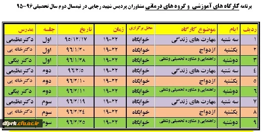 امتیاز دهید : برنامه کارگاه های آموزشی و گروه های درمانی مشاوران پردیس شهید رجایی 3 دوشنبه 9 اسفند 1395 ساعت 13:41