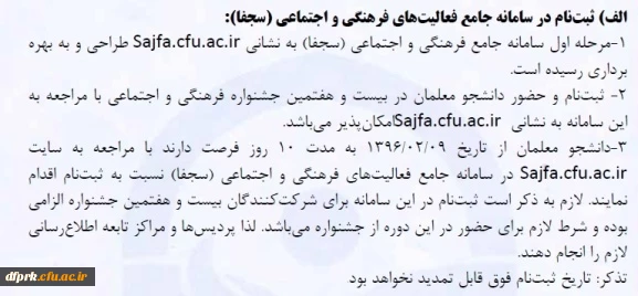 امتیاز دهید : ثبت نام در سامانه جامع فعالیتهای فرهنگی واجتماعی (سجفا) 2 سهشنبه 12 اردیبهشت 1396 ساعت 12:59