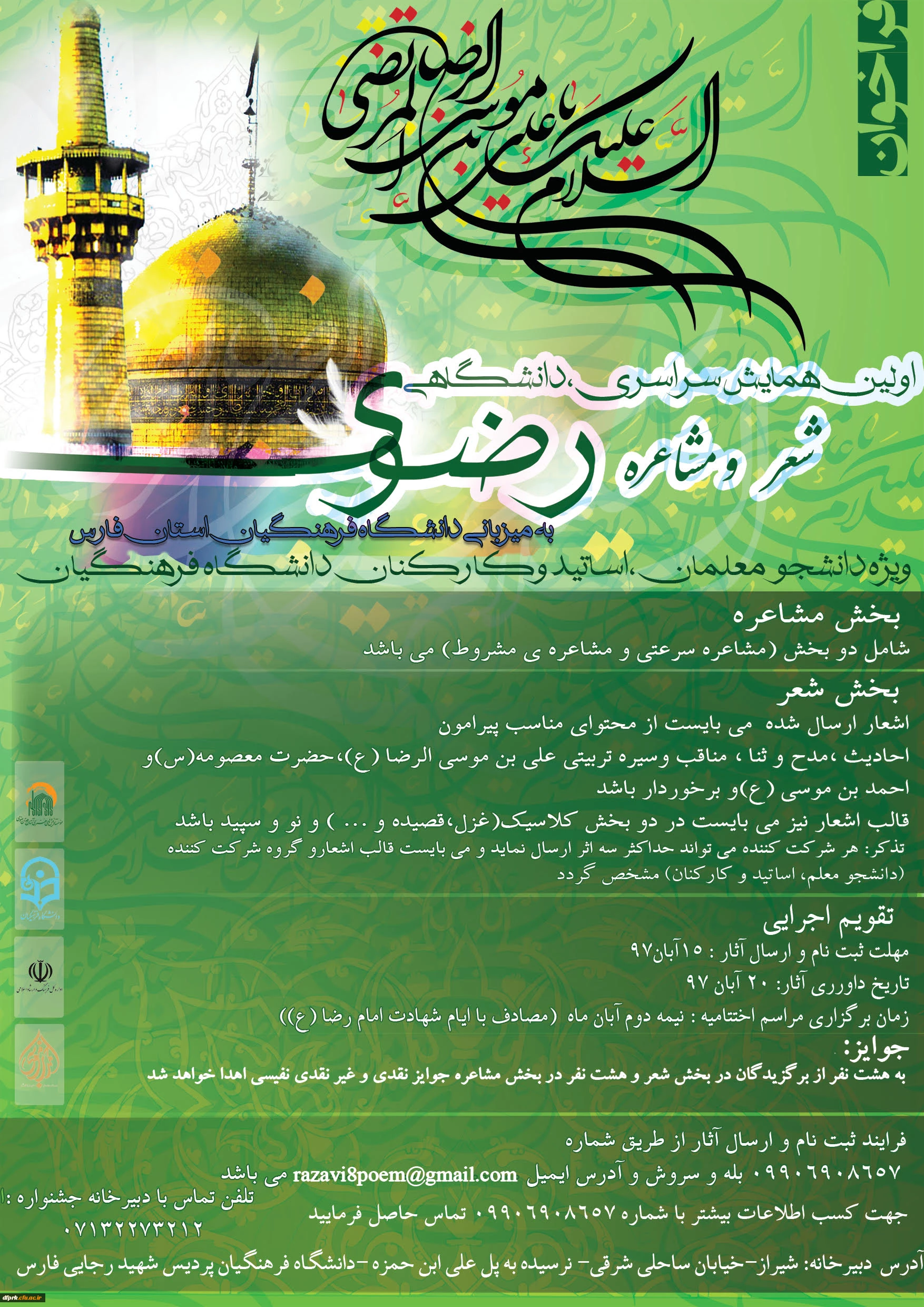 امتیاز دهید : دستورالعمل برگزاری همایش سراسری شعر رضوی به میزبانی استان فارس 2 چهارشنبه 25 مهر 1397 ساعت 10:39