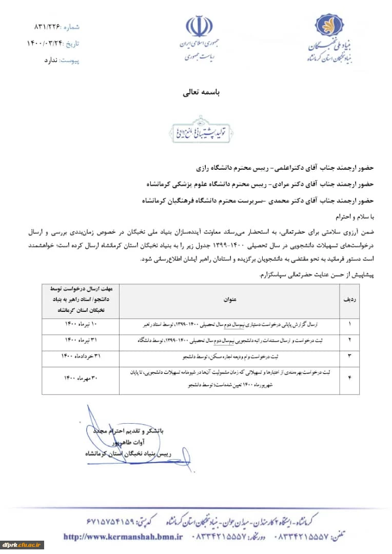 زمانبندی بررسی و ارسال درخواست تسهیلات دانشجویی و استادان راهبر برگزیده سال 1400-1399 توسط معاونت آینده سازان بنیاد نخبگان 2