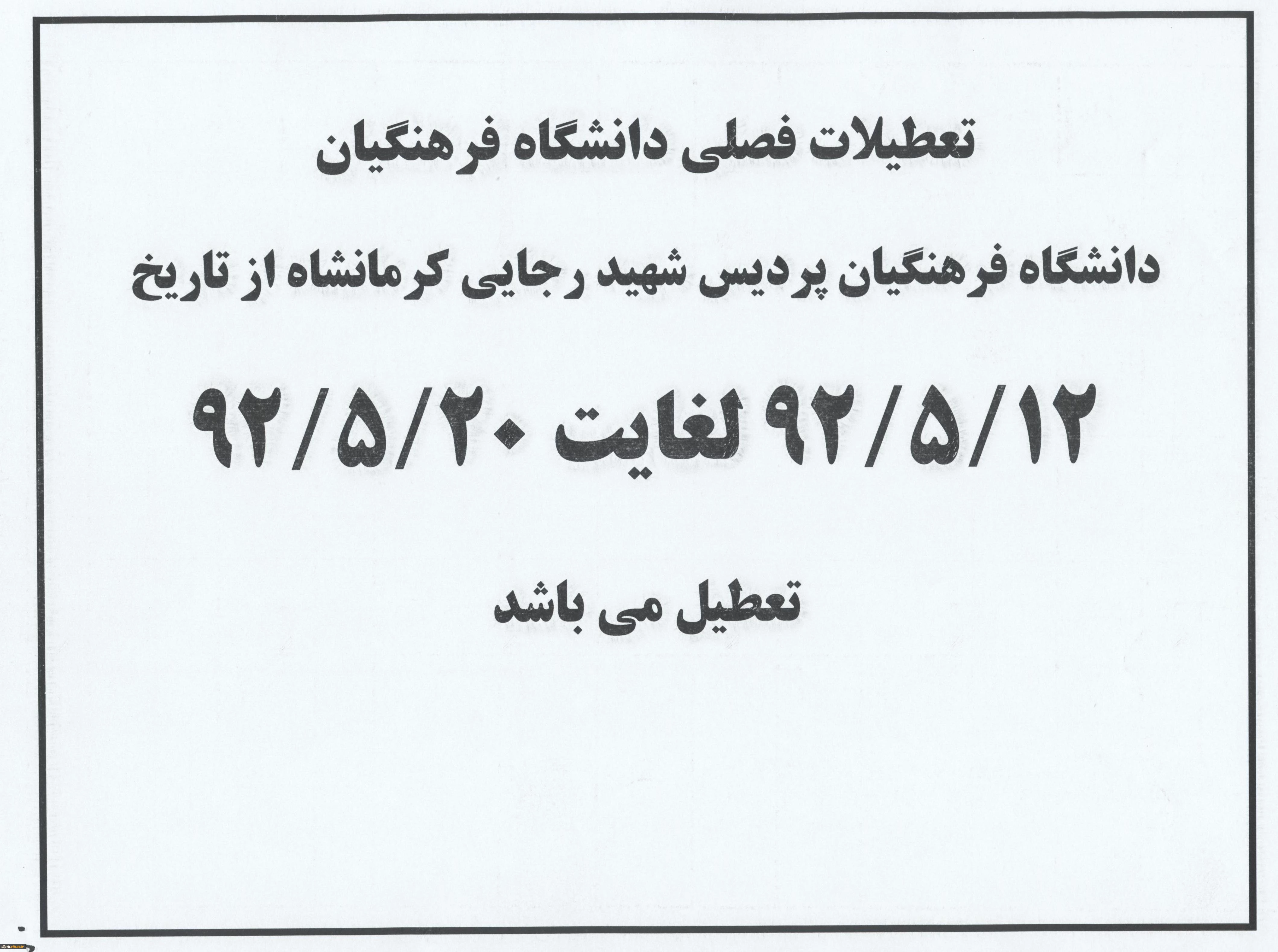 تعطیلات فصلی دانشگاه فرهنگیان دانشگاه فرهنگیان پردیس شهید رجایی کرمانشاه از تاریخ 12/5/92 لغایت 20/5/92 تعطیل می باشد
