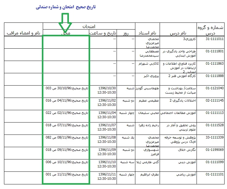 تاریخ صحیح و شماره صندلی در (ستون «محل») در کارت ورود به جلسه همانند تصویر مقابل درج شده است.